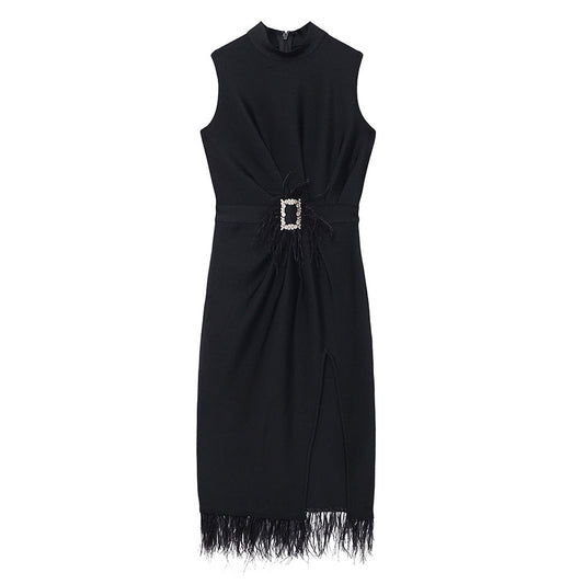 Beaded Belt Bandage Evening Dress Sleeveless Split Feather Party Tight Dress Cocktail