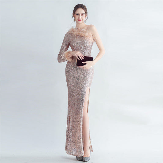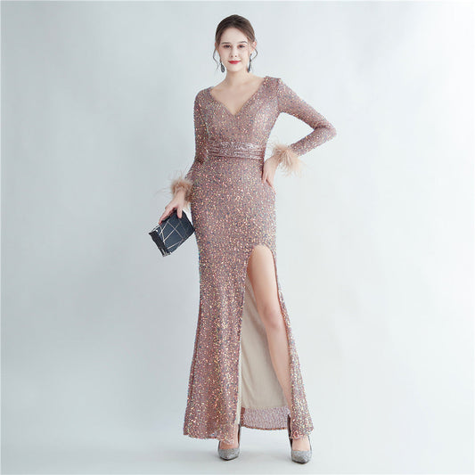 Ostrich Feather Cuff Sequined Fishtail Evening Dress with Side Slit