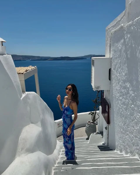 Einzigartiges Spaghettiträger Blau Chiffon Print Blumen Rüschen Ballkleid Langes Abendkleid Y7913