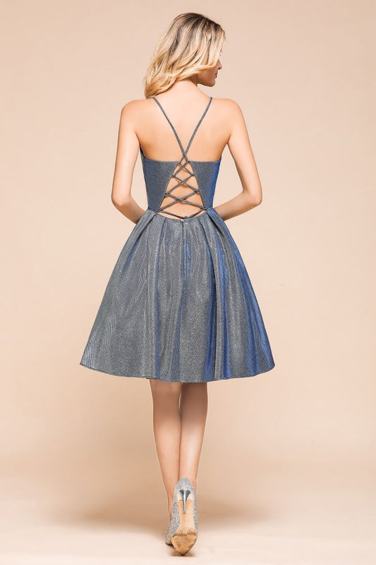 Sexy ärmelloses kurzes Homecoming-Kleid, helles Partykleid mit V-Ausschnitt und Tasche