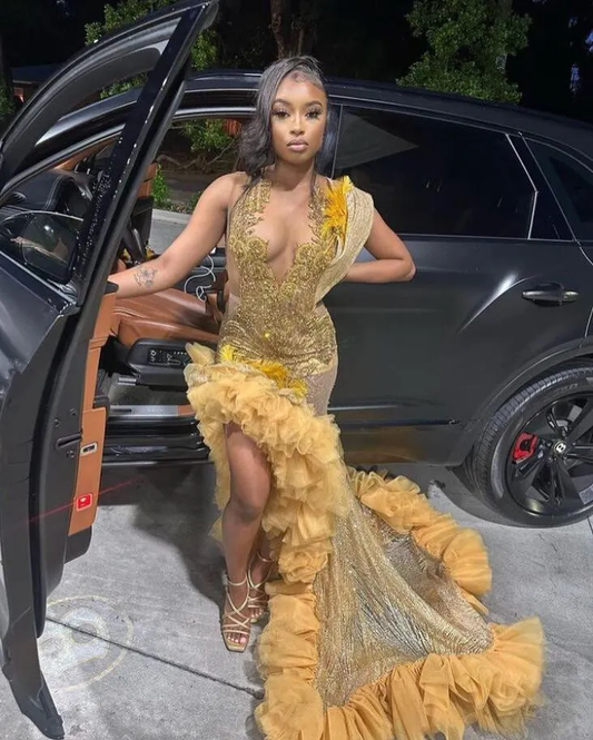 Luxuriöses Ballkleid mit goldenen Perlen für schwarze Mädchen, Meerjungfrau-Stil, formelles Abendkleid mit Seitenschlitz, Y6624