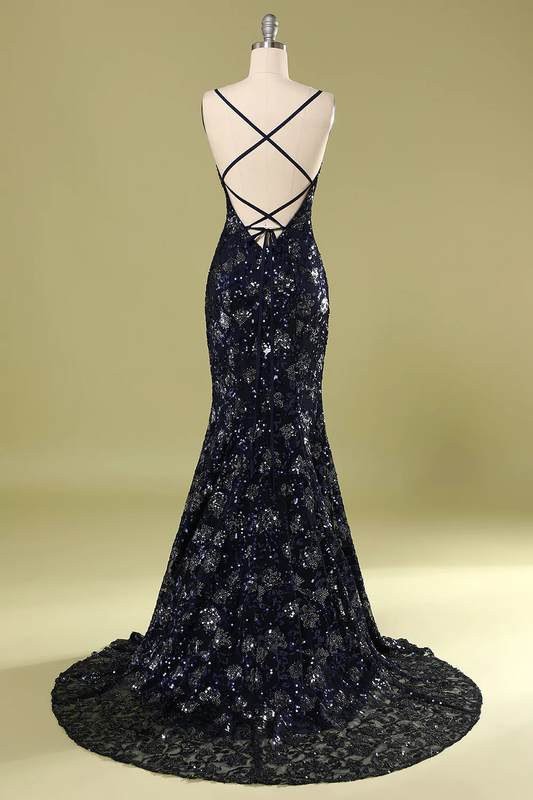 Glitzer Spaghetti V-Ausschnitt Ballkleider Lange Seitenschlitze Formale Abendkleider Y1849