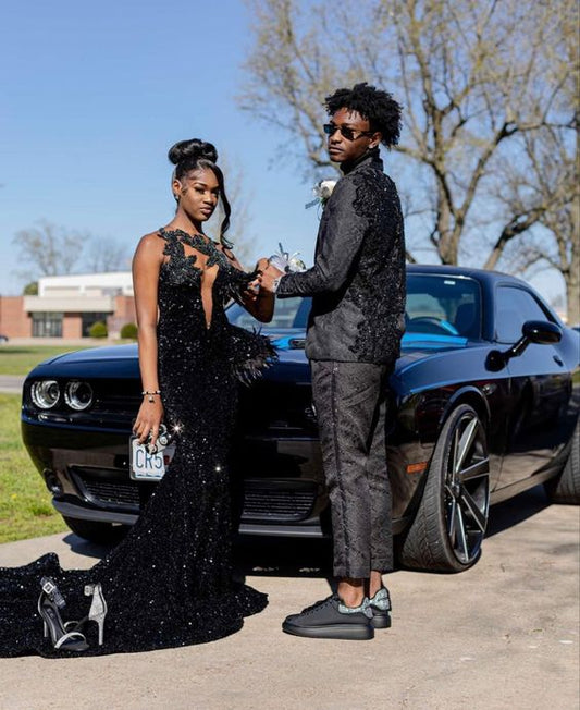 Schwarze Pailletten Meerjungfrau Ballkleid Sexy Abendkleid mit Schleppe Y561