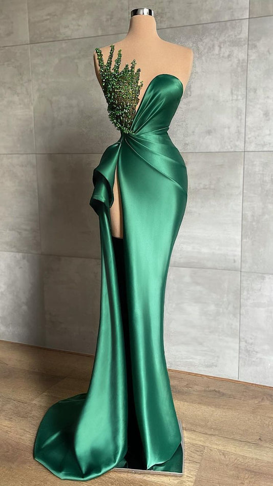 Tiefer V-Ausschnitt Perlen Langes Abendkleid Smaragdgrün Abendkleid Hoher Schlitz Y596