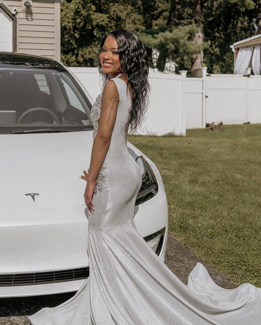 Wunderschönes, ärmelloses Meerjungfrauen-Ballkleid aus Stretch-Satin mit Pailletten und V-Ausschnitt und Applikationen