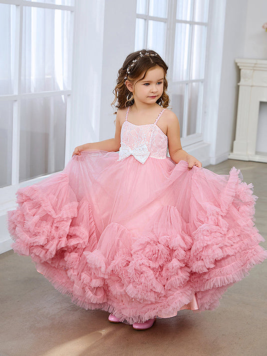A-Linie Tüll Bodenlanges Rosa Blumenmädchenkleid