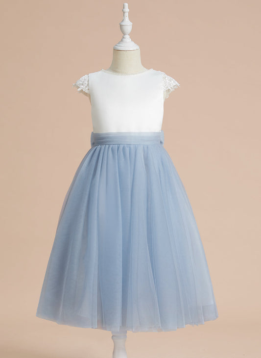 A-Linie Satin Tüll Wadenlanges Kleid für Blumenmädchen zur Erstkommunion