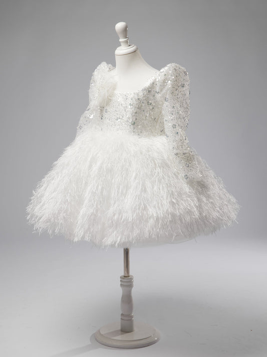 Knielanges weißes Baby-Mädchenkleid mit Tüllfedern