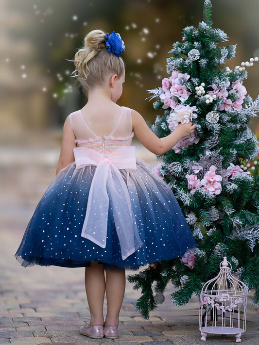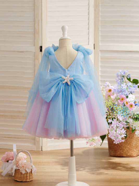 Knielanges blaues Mädchenkleid aus Tüll mit Sternpailletten