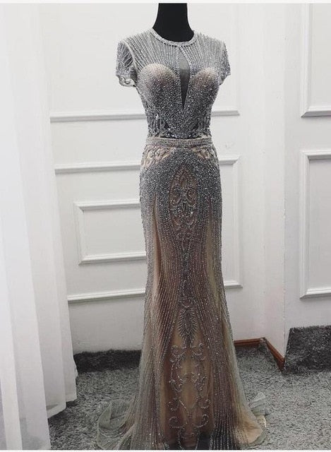 Luxuriöses silbernes, hautfarbenes Meerjungfrau-Abendkleid für Partys LA71686