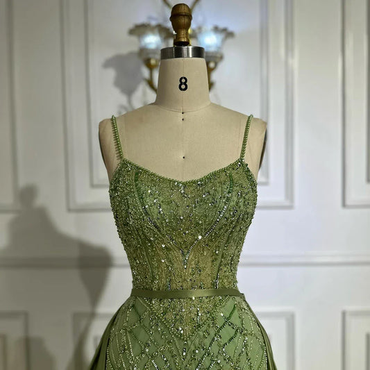 Luxus-Designer-Abendkleid mit Perlenbesatz in Salbeigrün und Überrock LA72733A