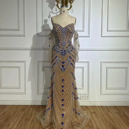 Luxuriöses blaues Abendkleid mit Perlen für formelle Anlässe LA72858