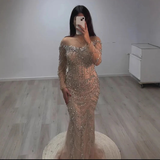 Luxuriöses Abendkleid mit Perlenbesatz, schulterfreien langen Ärmeln und funkelnden Pailletten LA72824A