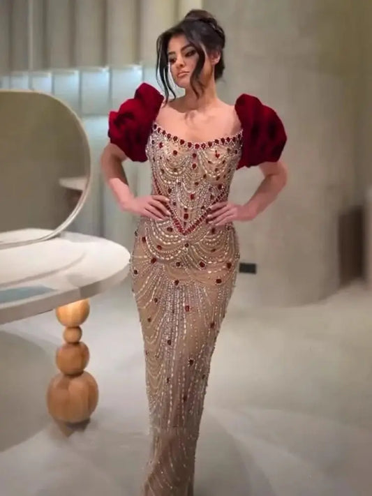 Luxuriöse Abendkleider mit Perlen und eleganten Puffärmeln, mit Perlen verziertes Design LA72903
