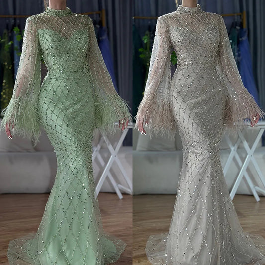 Luxuriöses Abendkleid mit Perlen und Federn in Salbeigrün mit langen Ärmeln LA72394A