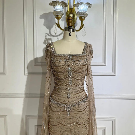 Luxuriöses perlenbesetztes Karamell-Abendkleid mit Cape-Ärmeln LA72604