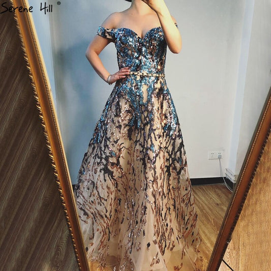 Goldblaue Pailletten Ärmellose Sexy Abendkleider 2025 Off Shoulder Sparkle A-Linie Abendkleid LA70373
