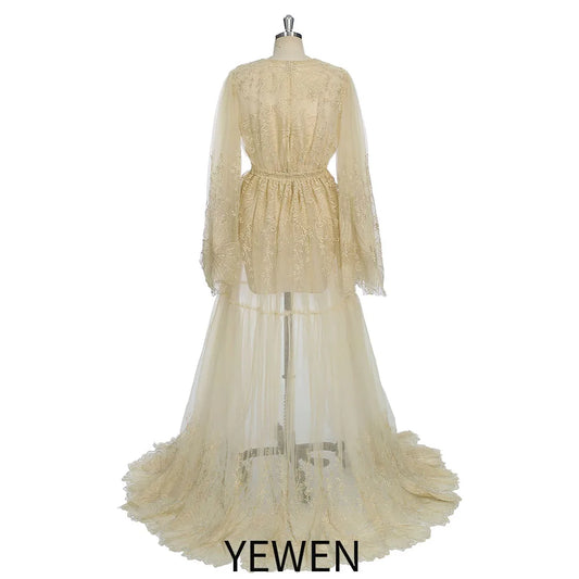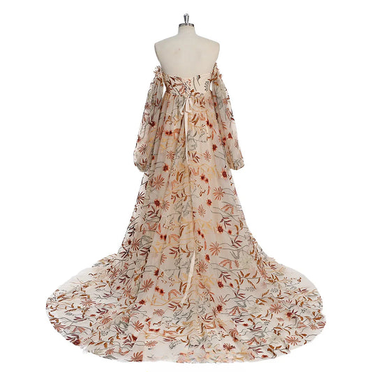 Schulterfreies Spitzenkleid mit Blumenstickerei, Umstandskleider für Fotoshootings, seitlicher Schlitz, Schwangerschafts-Shooting-Kleid, Sunnderly SY230320