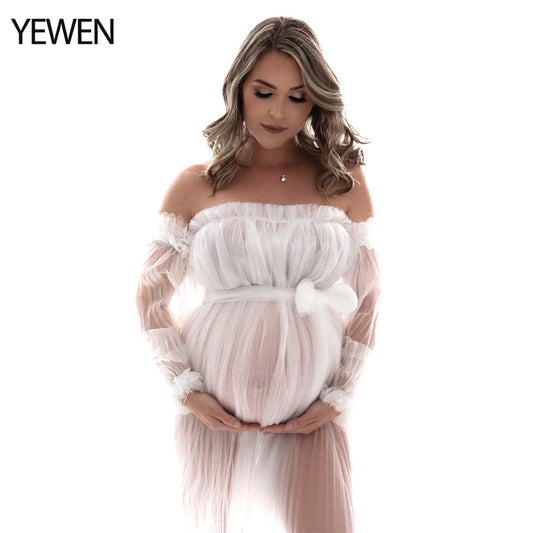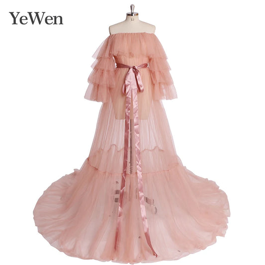 Rüschen-Tüll-Robe für Schwangerschafts-Fotoshooting, transparent, schulterfrei, Umstandsrobe, schwanger, Babyparty, Abschlussballkleid