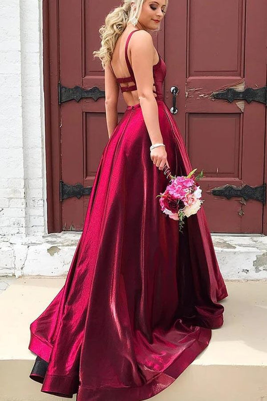 Taffeta A-line Scoop Spaghetti Straps Long Prom Dresses With Pockets