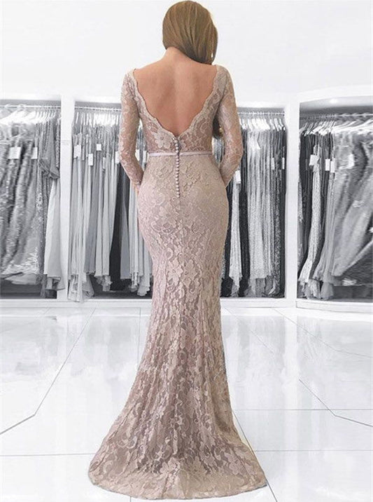 Langes, rückenfreies Ballkleid aus Spitze im Meerjungfrauen-Stil mit V-Ausschnitt und Ärmeln