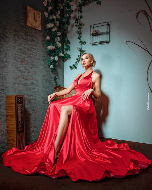 Rotes langes A-Linien-Neckholder-Ballkleid aus Satin mit Schlitz