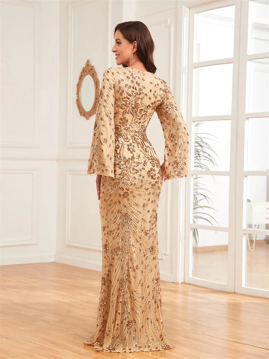 Luxus Champagner Abendkleider für Frauen 2025 Langarm Meerjungfrau formale Pailletten V-Ausschnitt Prom Hochzeit Party Kleider