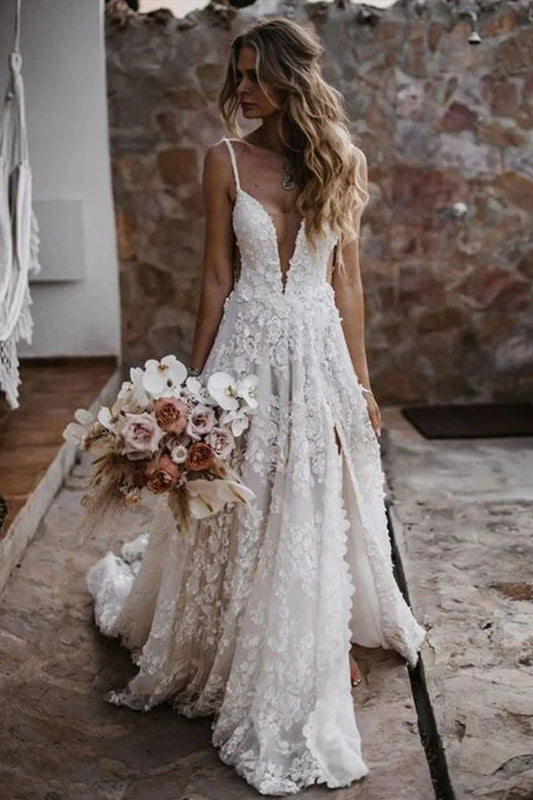 A-Linie Träger Spitze Strand Brautkleid Boho Brautkleid mit Schlitz WD657