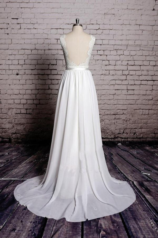 A-Linie Tiefem V-Ausschnitt Offenem Rücken Weiß Langes Brautkleid Brautkleid WD641