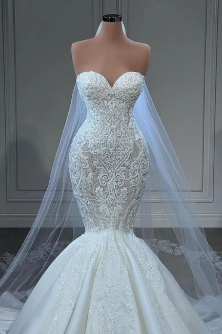 Elegante trägerlose ärmellose Meerjungfrau Satin bodenlange Brautkleider mit Spitze
