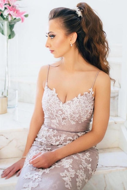 Elegante lange Spaghettiträger Spitze Meerjungfrau Ballkleider