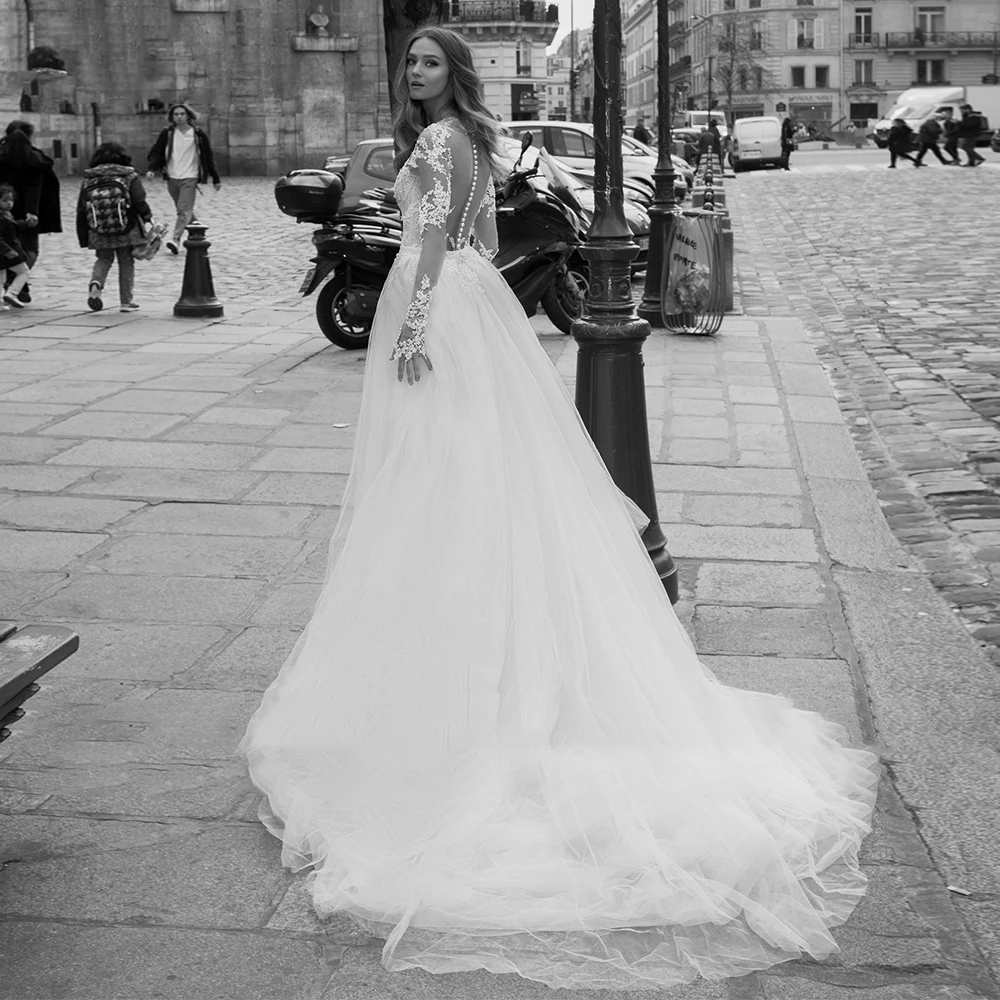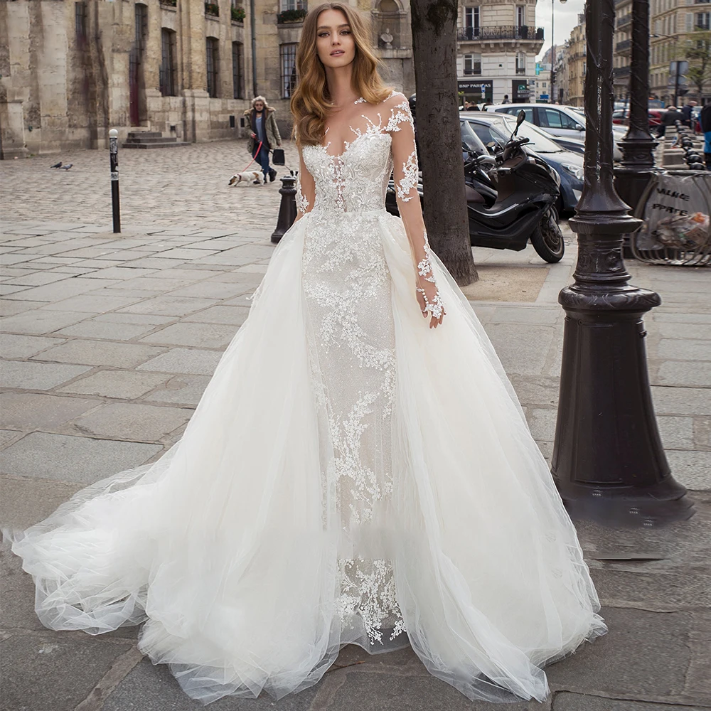 Luxus-Hochzeitskleid 2023, abnehmbar, 2-in-1, Meerjungfrau, bestickte Spitze auf Netz mit O-Ausschnitt, volle Ärmel, Knopf auf der Rückseite, Vestido de Novia