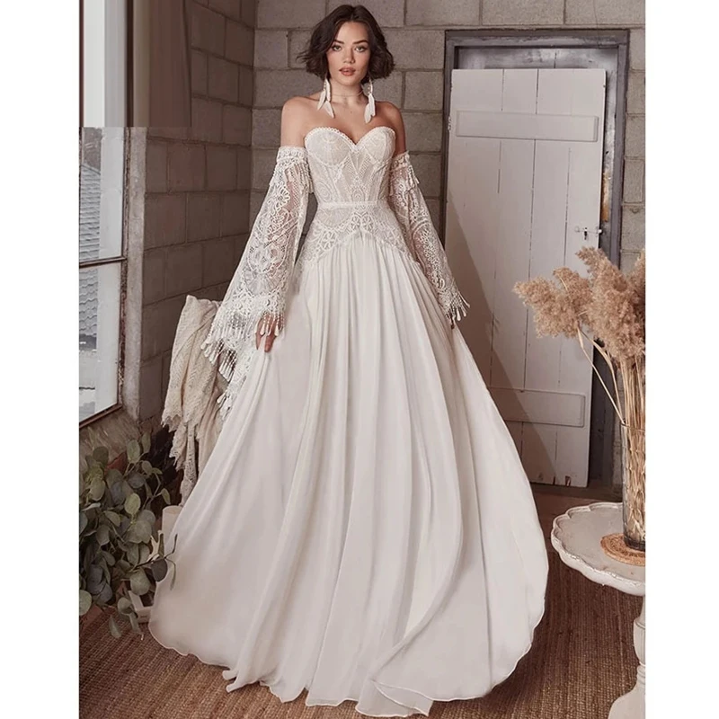 Meerjungfrau Bohemian Brautkleider Damen Spitze Flare Ärmel Elegante Schatz Trägerlos Chiffon Brautkleider A-Linie Robe Vestido