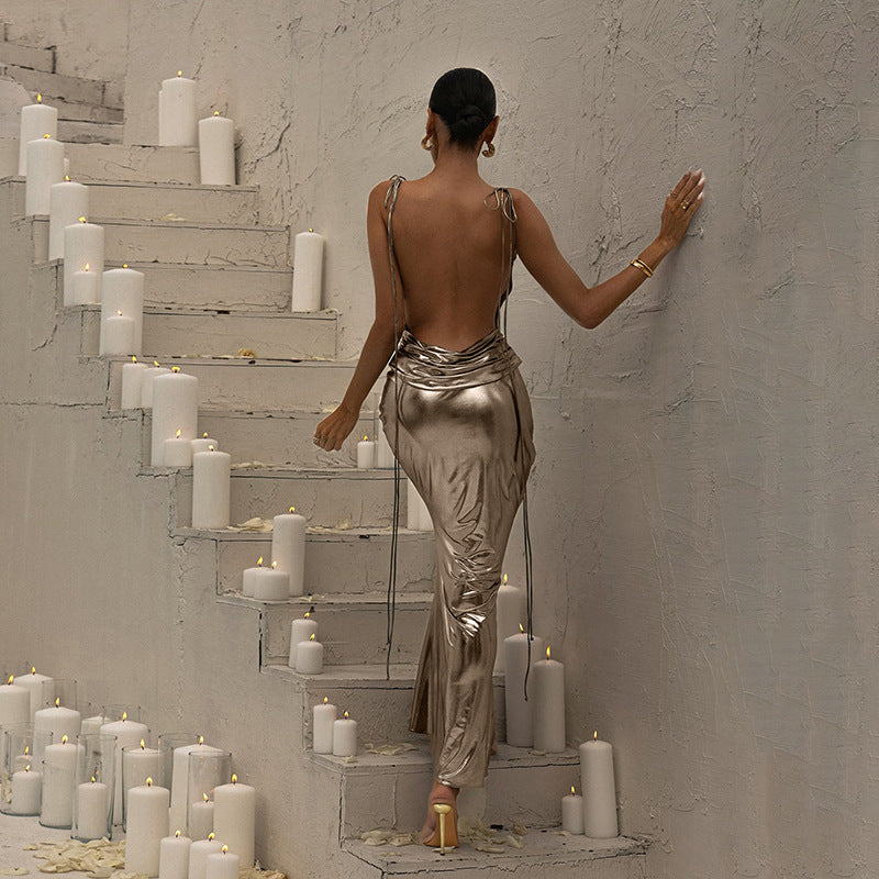 Metallic Coated Fabric Spring Summer Women Clothing off Neck Sexy Backless Slim Fit Evening Dress