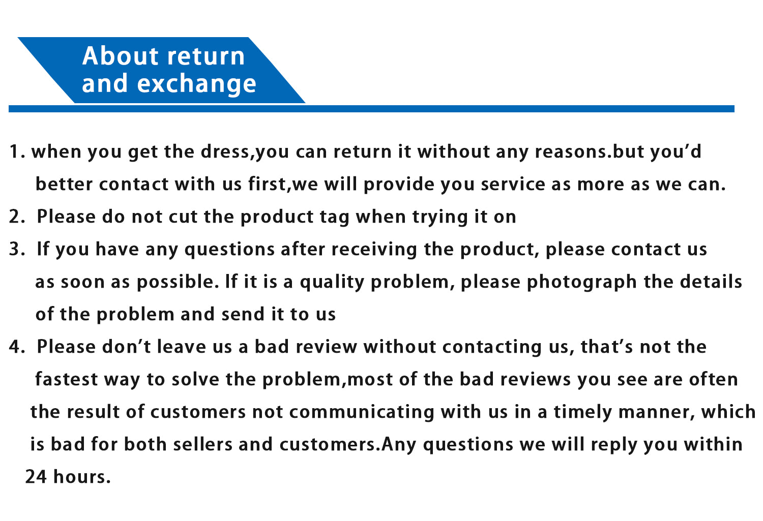 5. Das zurückgegebene Produkt muss in einwandfreiem Zustand (wie neu) sein. Sie können das Kleid anprobieren, achten Sie jedoch darauf, es nicht zu dehnen oder schmutzige Flecken zu hinterlassen, da es sonst nicht akzeptiert wird.