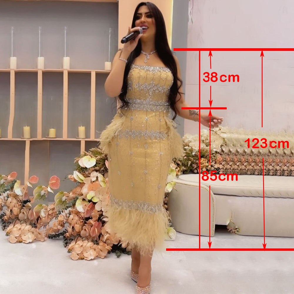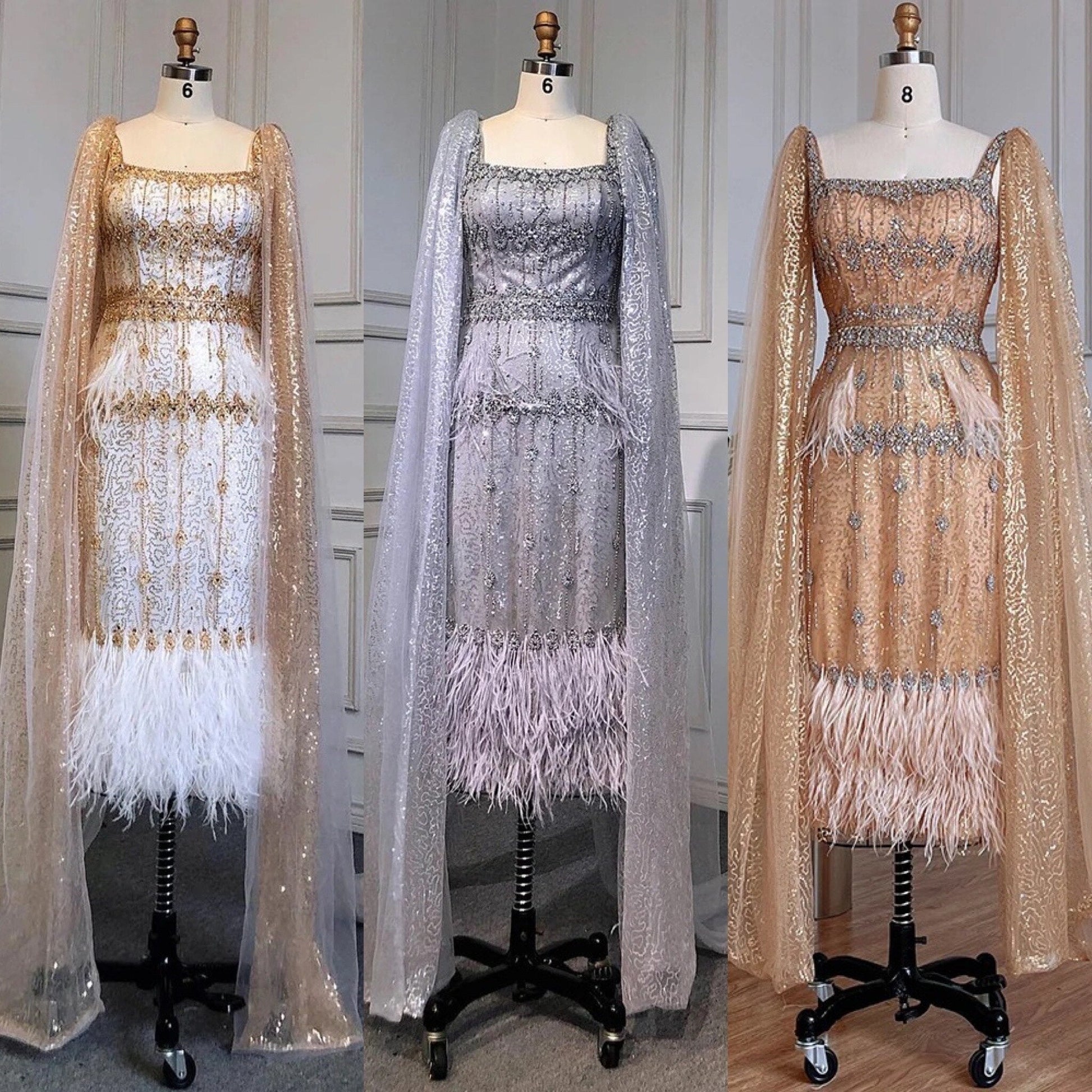 Grau Meerjungfrau Midi Länge Abendkleider Kleider Perlen Sexy Feder Hinten Bein Split 2025 Für Frauen Party LA71669