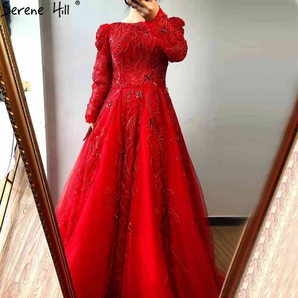 Muslimischen Rot Luxus Abendkleider Kleider 2025 Spitze Perlen A-linie Hohe Split Für Frauen Party LA70445