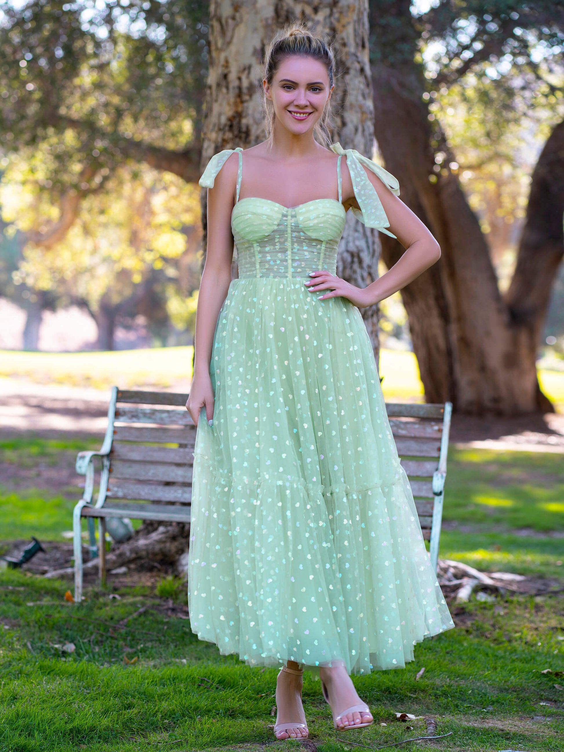Setzen Sie ein Statement auf Ihrem Abschlussball mit dem mintgrünen Tüllkleid mit Herz-Print von Kissprom. Dieses schlichte, knöchellange Kleid aus dem Jahr 2023 besticht durch seinen mintgrünen Farbton, den mit Herzen bedruckten Tüllstoff und das Korsett-Mieder mit integrierten Polstern und Stäbchen. Das drapierte Oberteil und die dekorativen Schleifenträger sorgen für einen eleganten Look. Der eingefasste Rock und die Seitentaschen sorgen für Funktionalität. Entdecken Sie bei Kissprom einzigartige und stilvolle Abschlussballkleider.