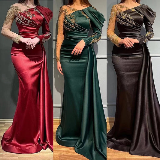 Elegante vestido de noche árabe de sirena color vino tinto con cuentas de satén de lujo estilo Dubái para mujer, vestido de fiesta de boda 2025 LA72556