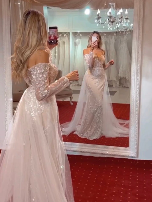 Vestido de noche árabe blanco nude sirena elegante sexy con hombros descubiertos y lentejuelas de lujo 2025 fiesta LA71892