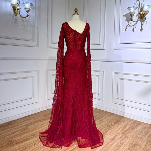 Vestido de noche elegante de sirena con mangas estilo capa y cuentas, color vino tinto árabe, para mujer, fiesta 2025, LA71838