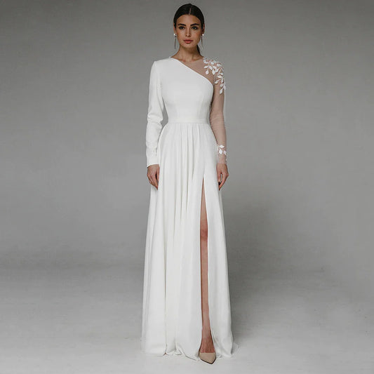 Vestido de novia asimétrico con abertura lateral, manga larga, para fiesta civil, con botones y apliques, largo hasta el suelo.
