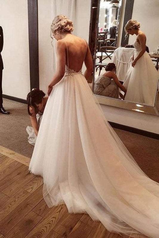 Vestido de novia playero de encaje y tul sin espalda, estilo novia WD432