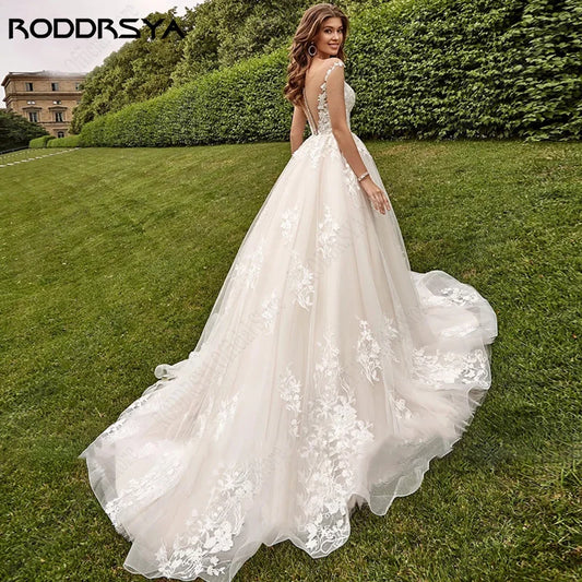 Vestido de novia largo de playa con escote en V, tul y apliques de encaje