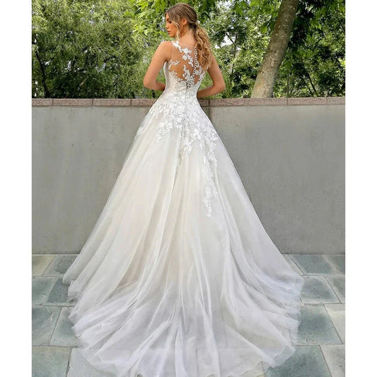 Hermoso vestido de novia de encaje en forma de A con tirantes sin mangas y largo hasta el suelo con abertura