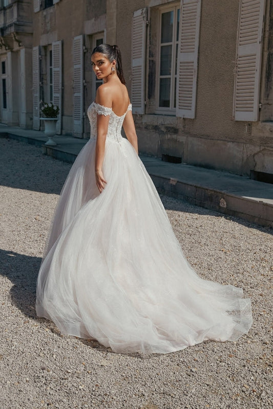 Hermoso vestido de novia largo de tul con apliques y hombros descubiertos en forma de A