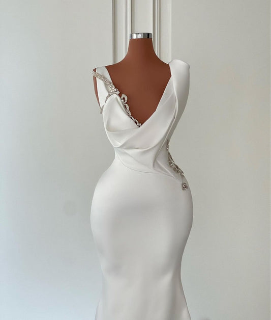 Hermoso vestido de fiesta de sirena con mangas largas de satén y joya larga