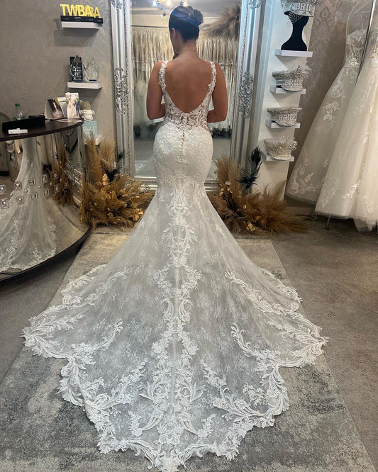 Hermoso vestido de novia largo de sirena con escote en V, sin mangas, de encaje, sin espalda y con cola