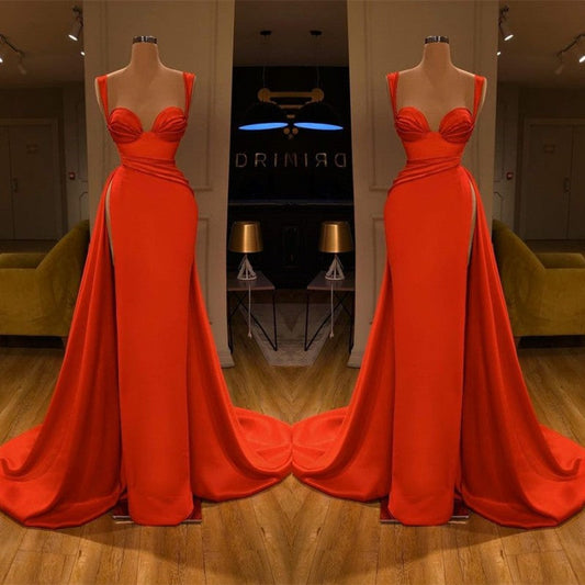 Hermoso vestido de noche rojo sin tirantes con abertura para fiesta, vestido formal de satén de corte A, vestido de graduación Y8170