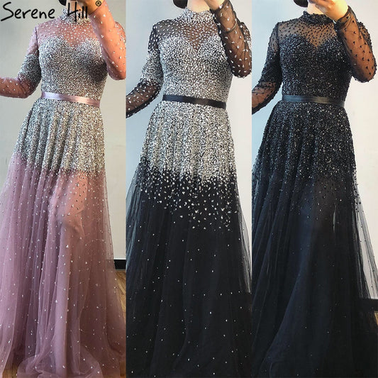 Vestido de noche negro plateado con escote en A y lentejuelas, mangas largas, sexy, formal, para mujer, fiesta, LA70066
